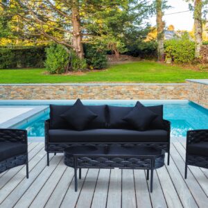 סט ריהוט גן לפקאדה כולל 2 כורסאות יחיד, 1 ספה דו ושולחן – כריות גב ומושב ריפוד בד, ראטן שחור או לבן אפרפר
